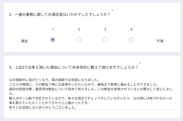 数人のチーム制で対応されているので、色々な視点でチェックをしていただいたり、父の時には気づかなかった事も教えていただくことができたりと心強かったです。